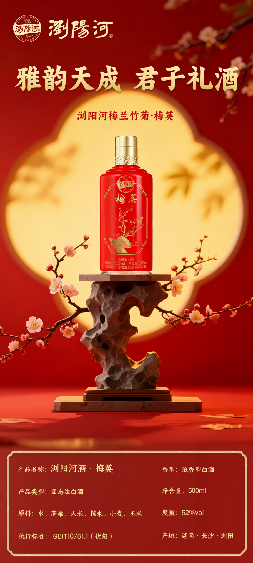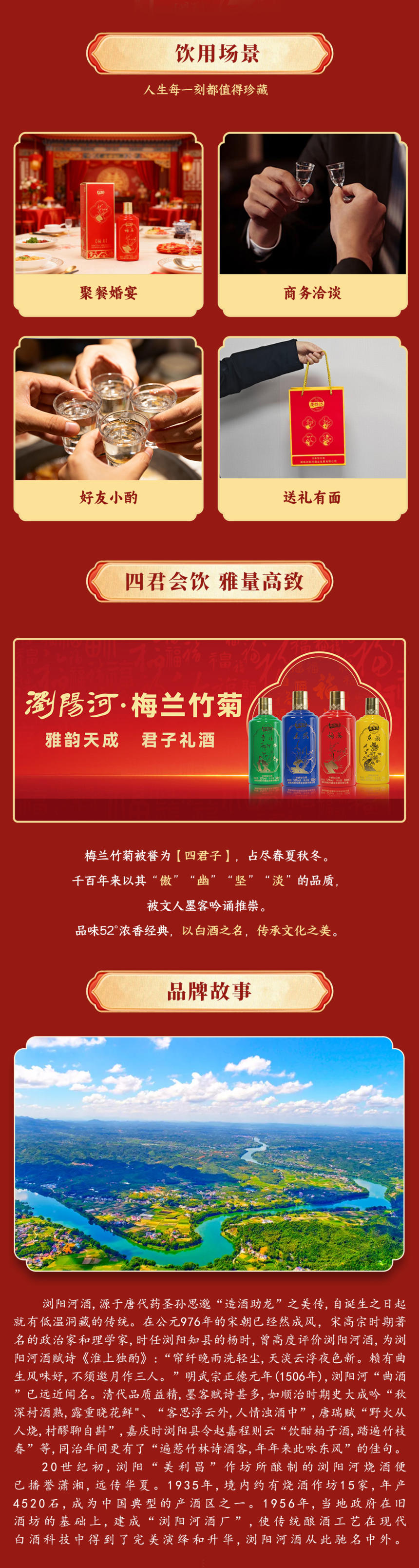 浏阳河·梅兰竹菊系列白酒产自白酒历史悠久的大围山巅、浏阳河畔,酒精度为52%vol,净含量500ml。设计以经典瓶身结合“中国红、帝尊蓝、翡翠绿、帝王黄”等主色调传达传统东方审美,四色四瓶,各显风格,展现“优雅从容、坦然人生”的品牌调性。